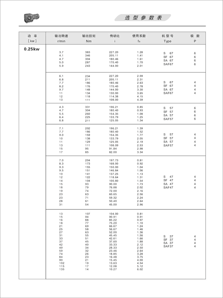 S系列斜齒輪蝸桿減速機選型參數(shù)表0.25KW
