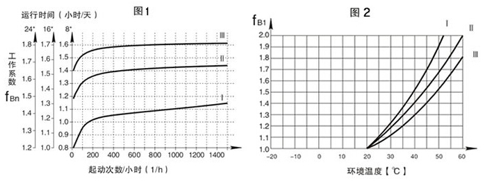 S系列選型:總工作系數(shù)f∑取決于每天工作時(shí)間,每小時(shí)起動(dòng)次數(shù)的工作系數(shù)fBn(圖1)和環(huán)境溫度變化的工作系數(shù)fB1(圖2),其關(guān)系為f∑ =fBn × fB1使選型表中的使用系數(shù)fB>f∑。