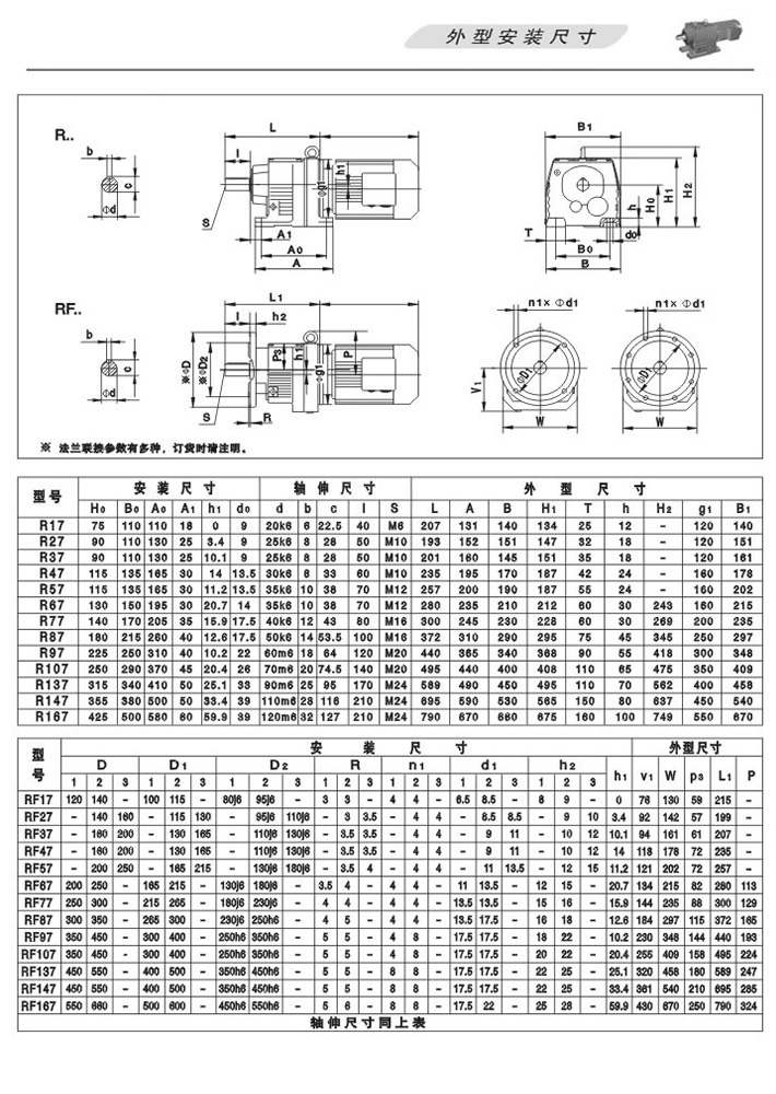 R斜齒輪減速機…(底角安裝)、RF…(法蘭安裝)外型安裝尺寸